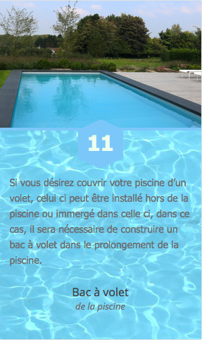 Si vous désirez couvrir votre piscine d’un volet, celui ci peut être installé hors de la piscine ou immergé dans celle ci, dans ce cas, il sera nécessaire de construire un bac à volet dans le prolongement de la piscine.